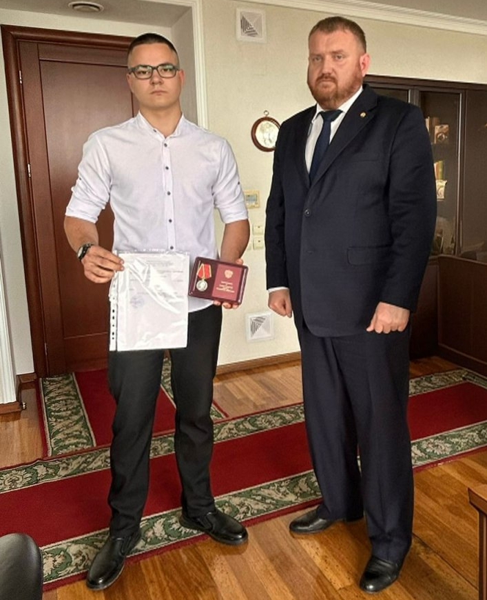 Глава города Артём Воробьёв лично вручил почётные знаки отличия родным погибших солдат: сыну и дочери героев.